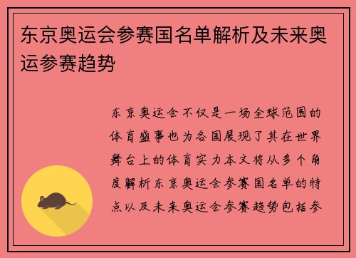 文章摘要:2020东京奥运会和2022北京冬奥会是两个具有深远意义的国际体育盛会,它们不仅展示了各国的竞技水平,还在多个层面上推动了时代变革。从科技创新到环保理念,从文化传播到国际合作,两届奥运会在形式和内容上均有突破,影响深远。东京奥运会注重科技与环保的结合,北京冬奥会则实现了冬季项目的新发展和国际化进程。这两场盛会不仅为世界带来了新的竞技高峰,也为全球奥运和体育文化注入了新活力。1、科技创新与...